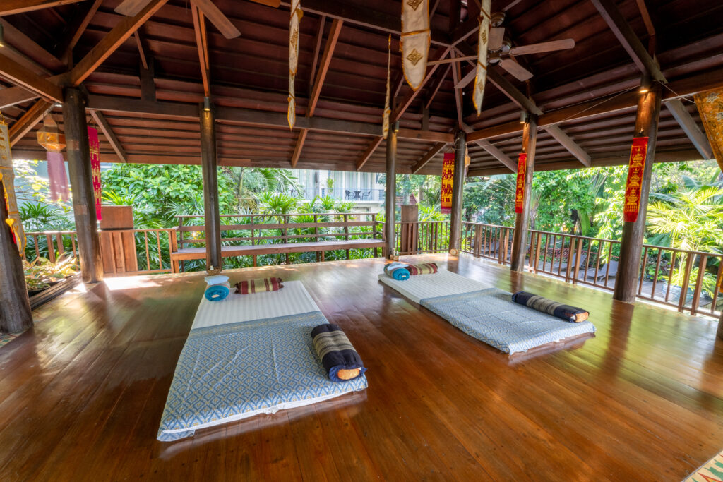 Las influencias de Lanna (norte de Tailandia) y Ayutthaya (Centro) son patentes en los pesados muebles de teca y los espejos con marco de madera. La mayoría de las habitaciones tienen terrazas o balcones. Los baños son elegantes con mamparas de vidrio y bañeras y están impecables. En el restaurante Na Aroon, por expreso deseo de los dueños, la carta está repleta de opciones vegetarianas tanto tailandesas como europeas. Un monje budista da clases de meditación.