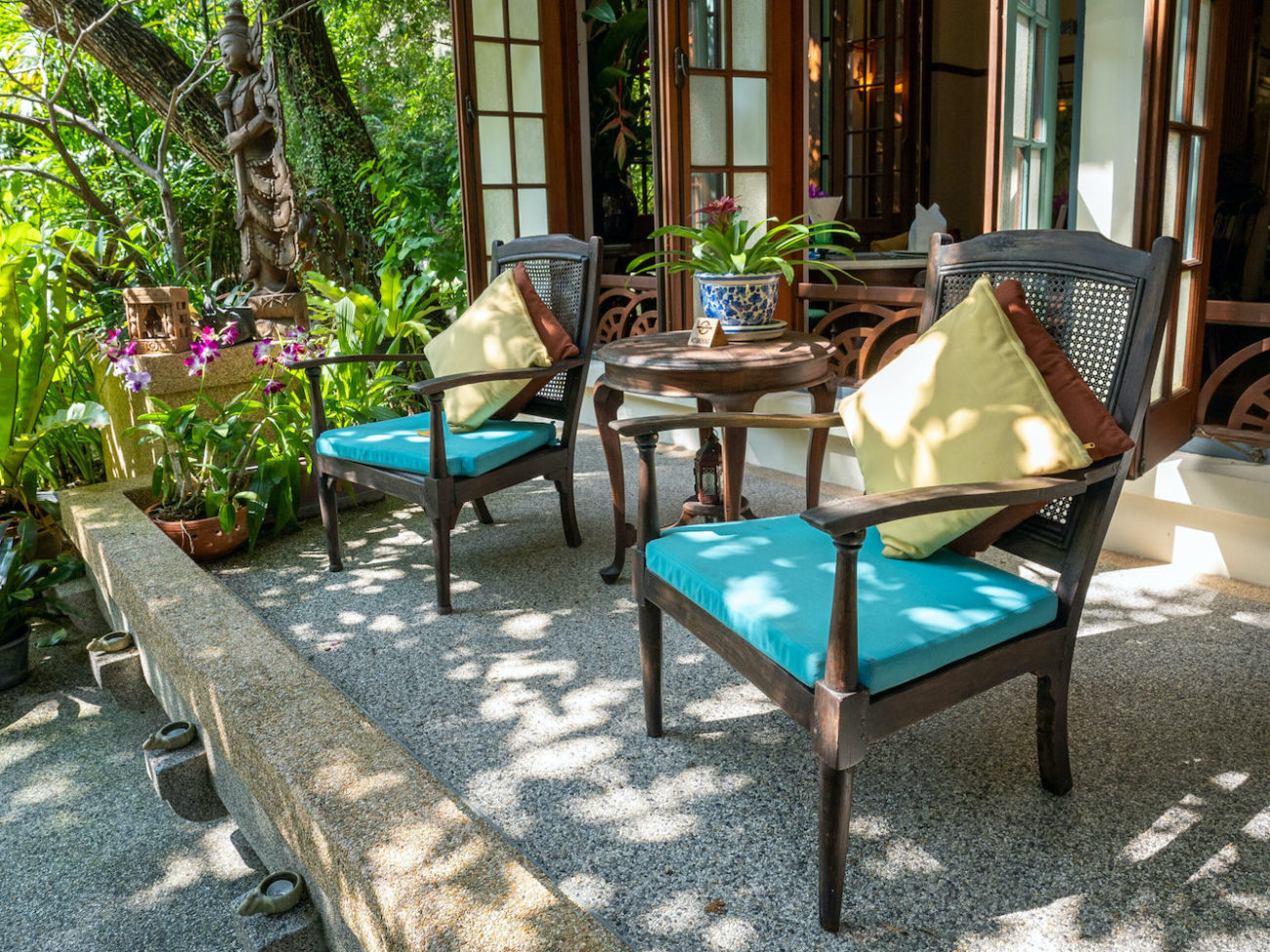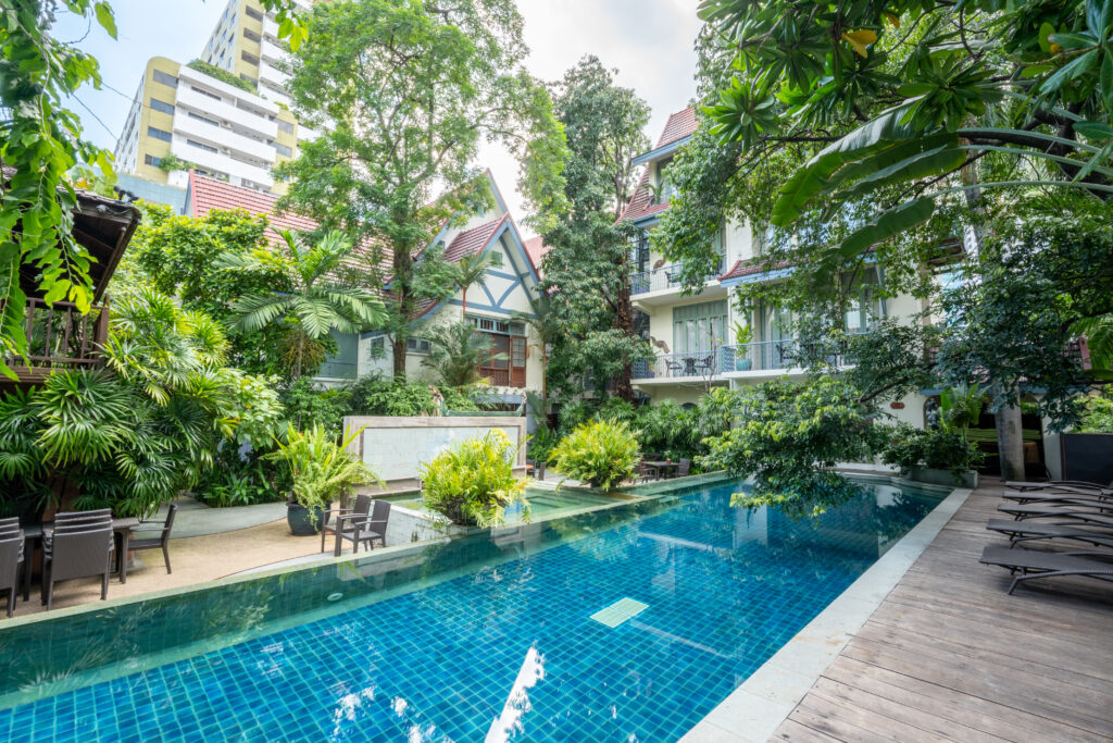 Limita con un canal desde donde puedes llegar navegando a la Casa de Jim Thompson o hasta Golden Mount y los principales hitos históricos de la ciudad. Inaugurado como hotel en 2008, se esconde entre frondosos jardines. El ala nueva no choca con los dos edificios originales, donde las antigüedades tailandesas y la teca se adueñan son protagonistas en las áreas comunes y las habitaciones. El personal es amable y competente. La piscina tiene un tamaño considerable teniendo en cuenta el tamaño y la ubicación del hotel, y lo mismo se puede decir del spa.