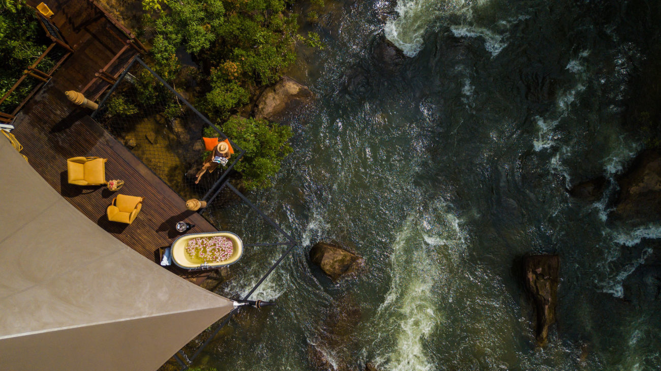 Colgadas sobre un río virgen, las 15 tiendas de esta exclusiva experiencia ‘gampling’ deparan un contacto directo con la naturaleza. De 100 metros cuadrados, cuelgan sobre pequeñas cascadas, de forma que el sonido del correr del agua es un bálsamo de propiedades terapéuticas insospechadas y ayuda a que nos sintamos en nuestra propia burbuja de hedonismo.