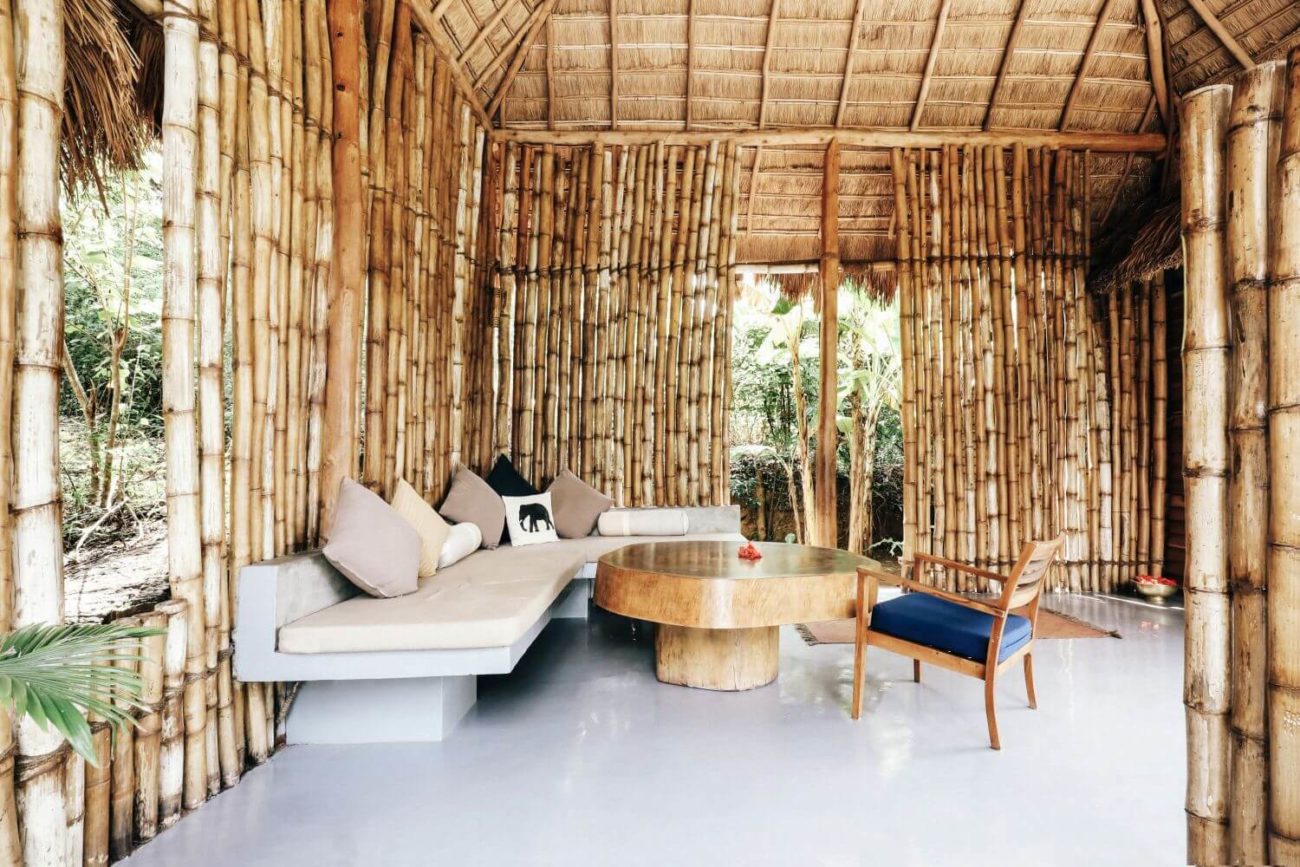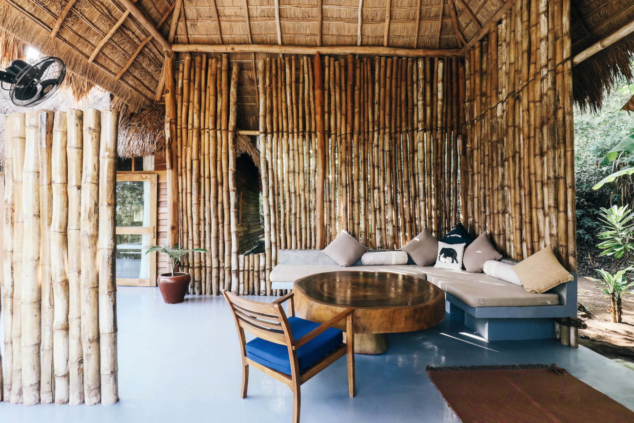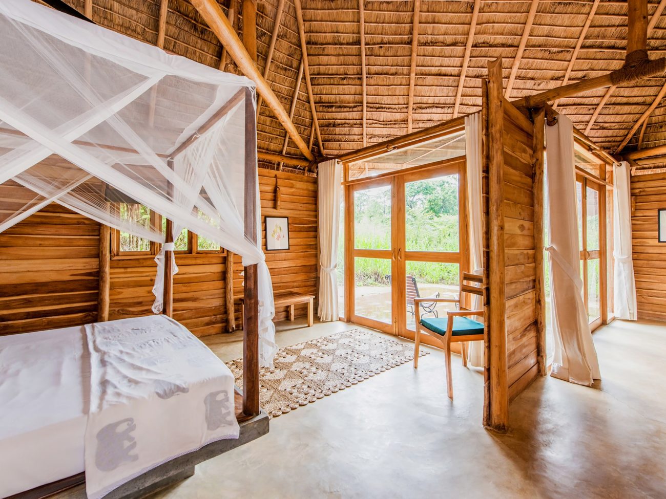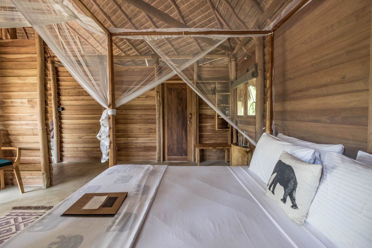 Dispersos entre la maleza, sus bungalós los construyeron artesanos con madera de teca de color miel, granito de origen local y paja para el tejado. Disfrutan de camas de gran tamaño con dosel, un cómodo sofá en L y una terraza privada. Los cuartos de baño son en gran medida al aire libre, por lo que los encuentros con insectos, ranas o geckos son comunes. Salúdales. Son tus simpáticos vecinos