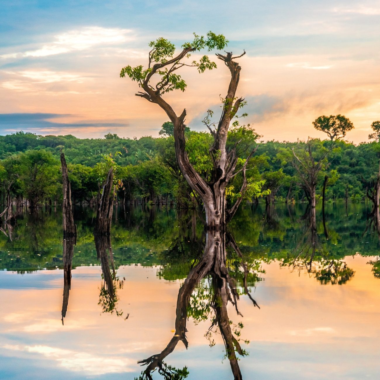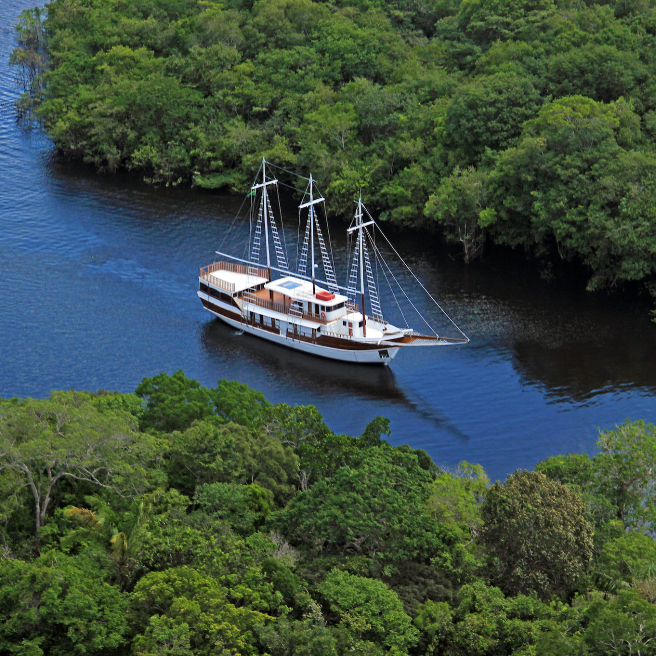 El pulmón verde de la tierra tiene su capital en Brasil: Manaos. Hasta allí volarás para emprender la gran aventura de recorrer el Amazonas y el río Negro a bordo de una embarcación de madera clásica de 34 metros de eslora y tres mástiles. Dotada de confortables camarotes, te llevará plácidamente hasta el archipiélago fluvial más grande del mundo –las Anavillhanas–, y a internarte en canoa por los sonidos de la noche, además de pescar pirañas.